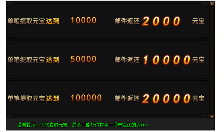 活动期间内,每日单笔充值指定数额元宝即可领取奖励!