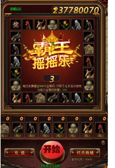 活动期间,玩家可花费元宝下注,随意选择8个图按中一个或者多个,点击开始按钮进行抽奖,抽奖结果与玩家所压图案相同则获得对应的元宝奖励。每轮最低押一注,最高99注,每注需要500元宝,押注越多奖励越高;不同图案有不同倍率,倍率越高返还元宝奖励越高,元宝会以道具形式只发给玩家。(温馨提示:具体细则可查看代币商城上方的问号)!