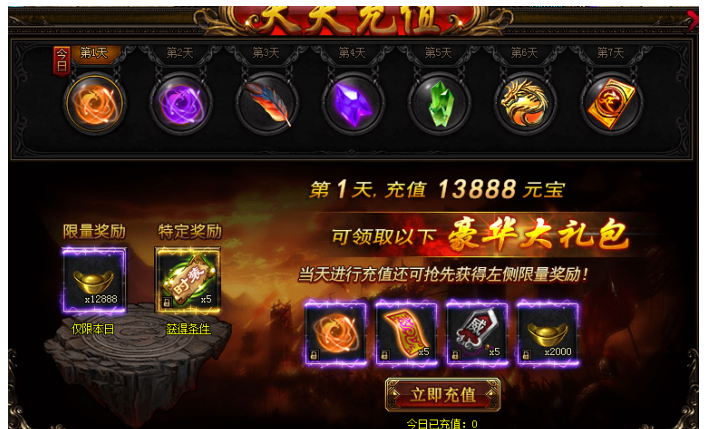 活动期间,活动期间,每日充值达到指定元宝即可领取豪华大礼+限量奖励+特定奖励。