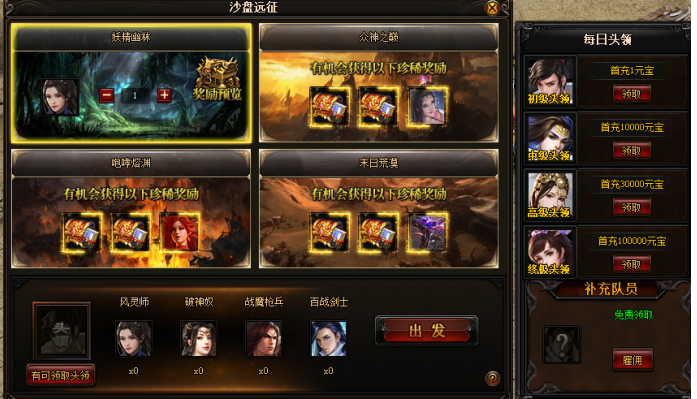 活动期间,沙盘远征活动可获得以往几弹卡片,每幅地图都需要指定的队员进行出征。头领可通过首充达到要求进行领取,领取后也可以通过消耗元宝获得。