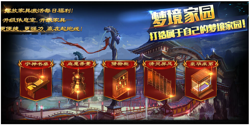 当建筑内家具满足条件后,可进行建筑升级,通过点击建筑内的NPC,选中升级选项消耗元宝即可升级建筑。升级后的建筑可使用更高级的家具,获取更丰厚的奖励收益。