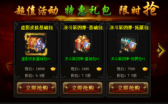 活动期间,可购买超优折扣每日限购礼包,神戒结晶、中级属强丹、传承之力、龙纹精华、印记灵魄、探宝符、羽毛、魂玉结晶、护盾结晶、暗器结晶、成就令牌、声望令牌等极品道具仅限活动期间跳楼优惠!