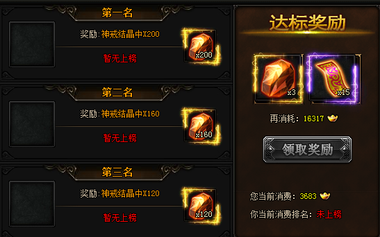 活动期间,累计消费20000元宝可获得达标奖励,消费第1、2、3名可获得排行奖励(至少消费50万元宝)!