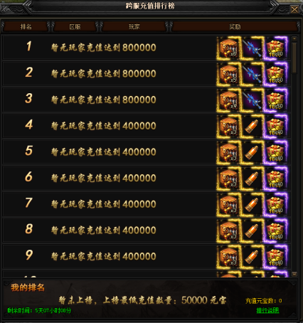 活动期间,开启跨服充值排行榜,排行榜前50名玩家可获得精美道具奖励,排行榜前三的玩家可获得特殊奖励。所有奖励在活动结束时发放奖励。活动会在最后一日23:59:00秒开始统计结算,请玩家勿在最后一分钟充值,有可能不统计。(注:因数据量较大,排行榜仅会在整点时刻刷新,请玩家谅解)。