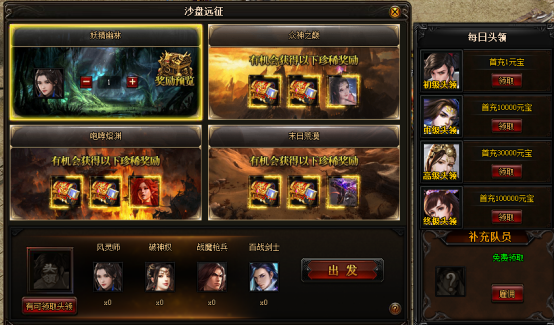 活动期间,沙盘远征活动可获得以往几弹卡片,每幅地图都需要指定的队员进行出征。头领可通过首充达到要求进行领取,领取后也可以通过消耗元宝获得。