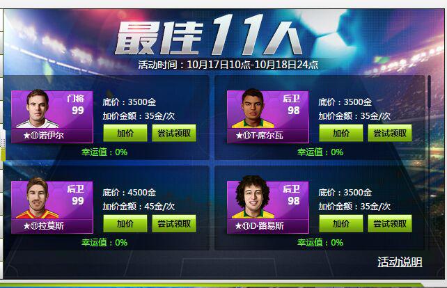 活动内容:在活动期间,大家一定要来参与史无前例的“最佳11人”竞拍活动!进入活动界面后,大家可自由参竞拍11位巨星品质球星。11位巨星球员中,每一位均设有相应的金币低价,每次竞拍均需相应金币加价。每位球员每次加价会增长1%幸运值,当幸运值达到100%,点击“跟我走”该名球员即可加入到球队阵容中!这是史无前例的“最佳11人”超级竞拍,这是史上最刺激的球员竞拍,在这11为最佳球员中,大家要谁就全力竞拍,百分百幸运,百分百领走他!祝大家好运!
