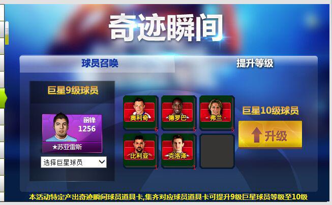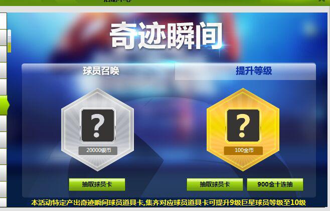 活动内容:在活动期间,玩家参与“奇迹瞬间”活动。该活动能够产生21种球员道具卡,使用这些道具,可使玩家阵容内的巨星球员当前上限9级提升至10级!
