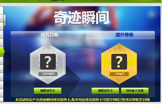 活动内容:在活动期间,玩家参与“奇迹瞬间”活动。该活动能够产生21种球员道具卡,使用这些道具,可使玩家阵容内的巨星球员当前上限9级提升至10级!
