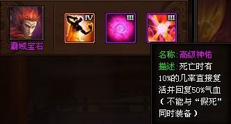 | 神佑 | 死亡时有一定几率直接复活并回复一定百分比的气血(不能与“假死”同时装备) |