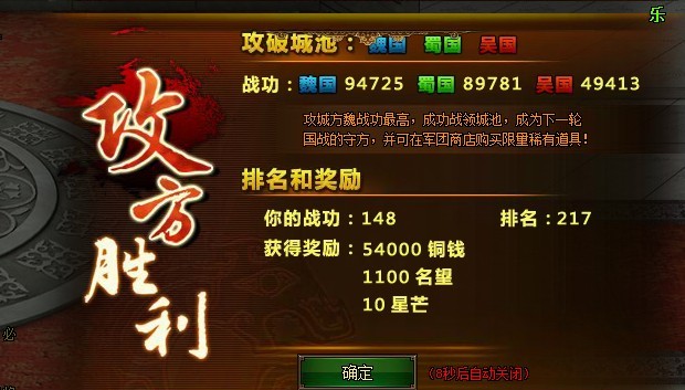 国战场地分为“外城”和“内城”,攻破外城之后进入内城,攻破内城即可攻破城池