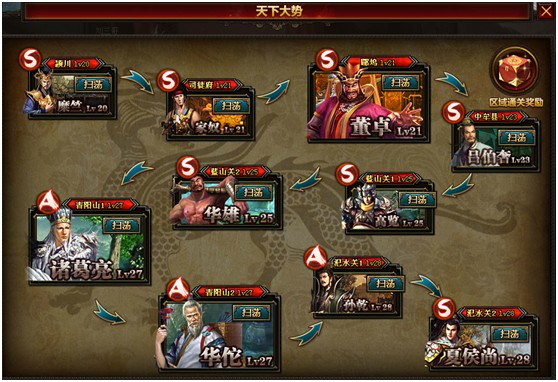 副本系统是《霸域》的基础系统之一,玩家可以通过副本而获得成长。随着玩家的主线剧情,玩家将逐步开启不同的副本,三国历史在这里被展现。玩家每次进入副本需要消耗20体力,如果不进行任何战斗就出来会返还体力。玩家在副本中可以找到各种宝箱和机关,当然也会获得大量经验和奖励哦。