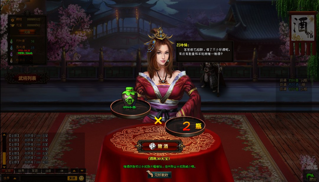 3、赌酒:射箭完成后,吕布的女儿吕玲绮出现,愿意与玩家赌酒。玩家可以选择赌酒或者见好就收。如果赌酒成功,不仅获得的酒会大幅增加,而且吕玲绮还会脱掉她的衣服哦!随着一次次的胜利,玩家手中的酒会成倍增长,而吕玲绮的衣服则被一件件地脱掉。当然,如果您胆小,大可以选择“见好就收”。