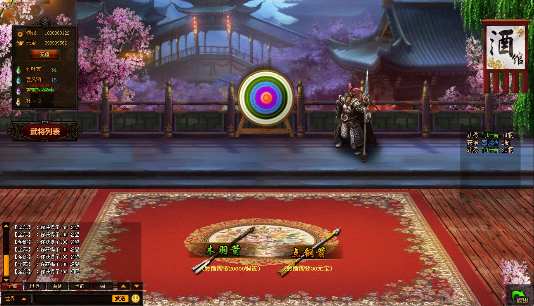 2、射箭玩法:该玩法取材于吕布“辕门射戟”的典故。玩家可以花费一定铜钱或元宝进行射箭,根据射箭的环数而获得不同品质的酒。