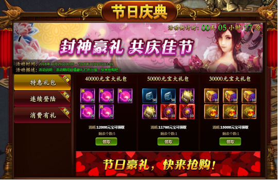 活动内容:在活动期间,限时特惠礼包、连续登陆以及消费有礼活动限时上线,限时福利等你来领!