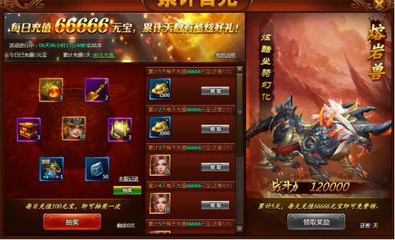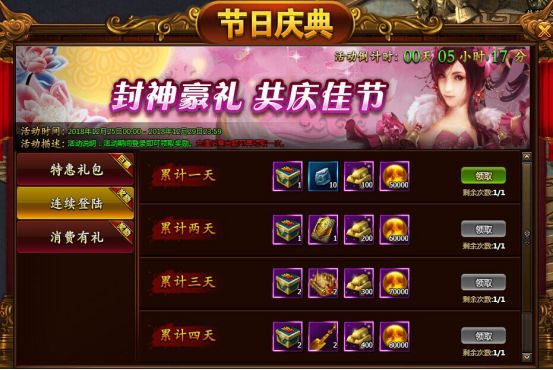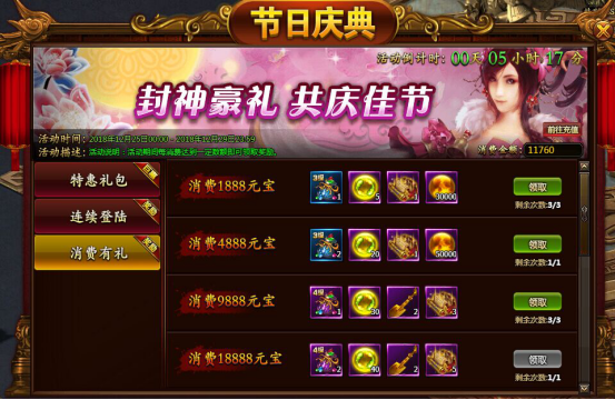 活动内容:活动期间,玩家每日充值指定金额,累计天数达到活动要求即可领取豪华奖励,并且每日充值100元宝,即可获得免费抽奖资格一次,有概率获得稀有封神与稀有道具哦。