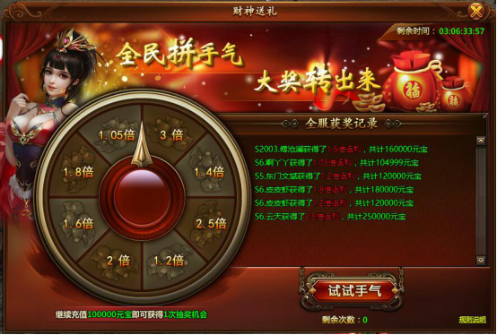 活动内容:活动期间,每充值100000元宝即可获得一次抽奖次数,每消耗1次抽奖次数即可抽出倍数的元宝。
