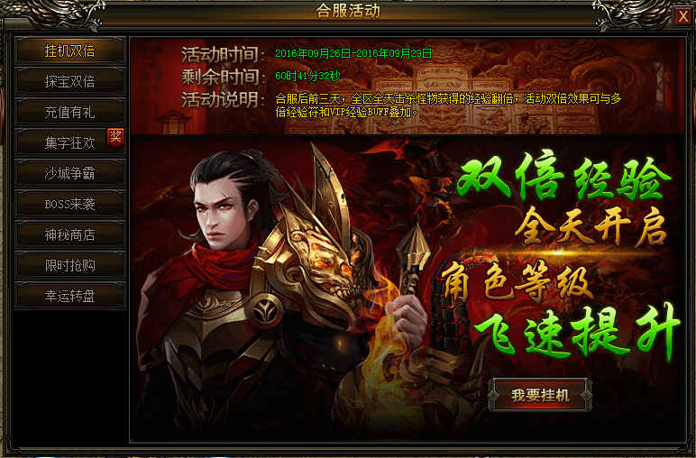 合服前三天,全区全天击杀怪物获得的经验翻倍,活动双倍效果可与多倍经验符和VIP经验BUFF叠加。