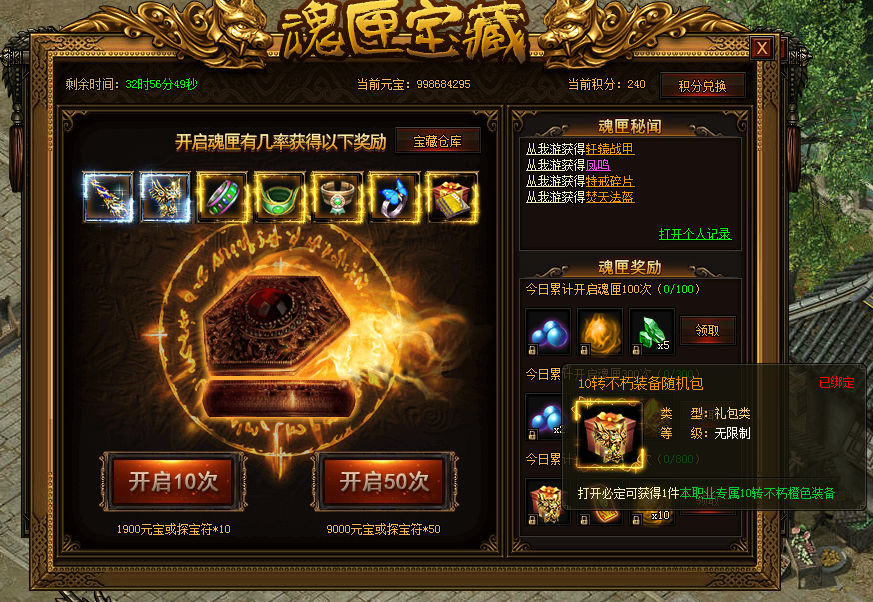 随机10转不朽装备包*1;魂匣BOSS召唤符*1;10星洗练石*10