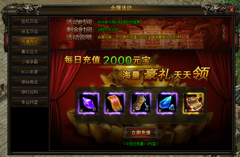 合服前三天,每天充值2000元宝,海量豪礼天天领!