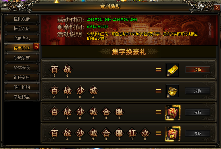 合服前三天,可通过击杀BOSS和小怪掉落文字,集齐文字即可兑换相应的组合奖励!(集齐不同的文字越多,可领取的奖励越好)