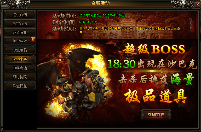 合服前三天,超级BOSS每天将在18:30进攻沙巴克,玩家进入合服活动里BOSS来袭分类点击立即前往,击杀超级BOSS可掉落海量道具及百战装备进阶道具百战之心!