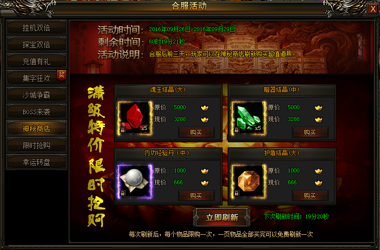 合服前三天,玩家可以在神秘商店刷新购买超值道具!打6.5折,小伙伴们千万别错过。