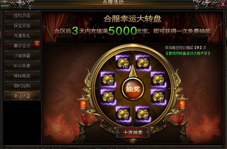 合服前三天,每充值5000元宝,即可获得一次免费抽奖机会!免费抽奖将赢得丰厚的元宝奖励,达到条件的小伙伴们可别忘了来领取奖励。
