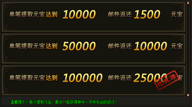 活动介绍:活动期间内,玩家每天最多可以领取下列全部返还!以下返还根据玩家单次提取的元宝数量来判断是否达到要求,当玩家单次提取的元宝数量达到甚至超过下列要求时,只会发送剩下的最高一项返还奖励邮件给玩家,直到以下返还均已发放。