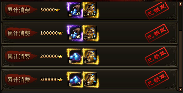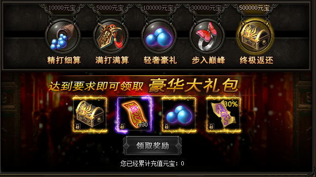 活动介绍:活动期间,累计充值达到指定梯度即可领取对应奖励!转生丹、探宝符、造物石、全套高级符文!高级特戒!你值得拥有!