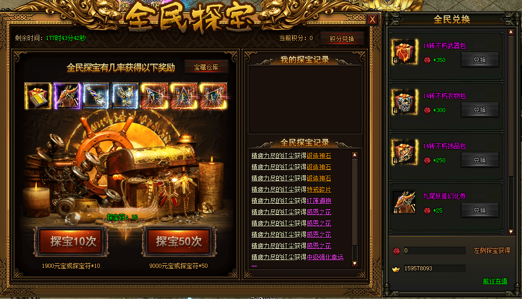 活动介绍:全新坐骑九尾妖狐登录全民探宝!错过了兑换14转各种装备的小伙伴这次可不要再错过哦。