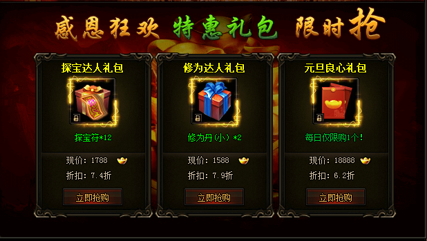 (注:探宝、修为两种类型的礼包分为五档(达人、王者、神话、神王、超神)购买了前面一档才能出现第二档,每日0点刷新购买次数。)