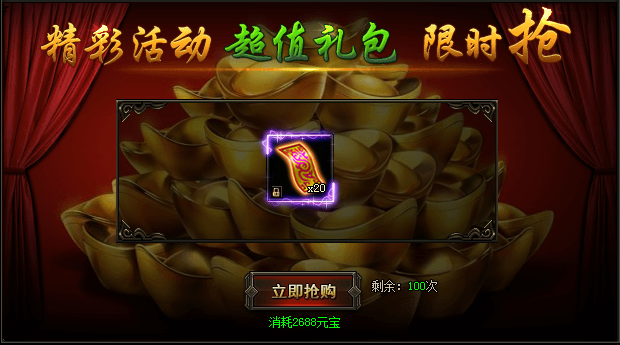 活动介绍:你还在抬头看着探宝的奖励吗?活动期间,每日限量100个探宝礼包就在个人限购!