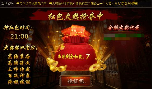 活动期间,每天21点可抢新春红包!每人可抢10个红包,红包抢完全服必出一个大奖,大奖从奖池中随机产出。该活动从1月25日起开启,请留意游戏内的活动时间。
