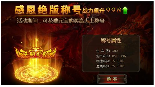 活动期间,消耗3888元宝可购买永久性绝版称号,仅此一次,错过不再有!!