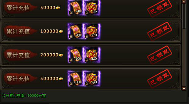 活动期间,玩家每日累计充值对应的元宝即可领取奖励!