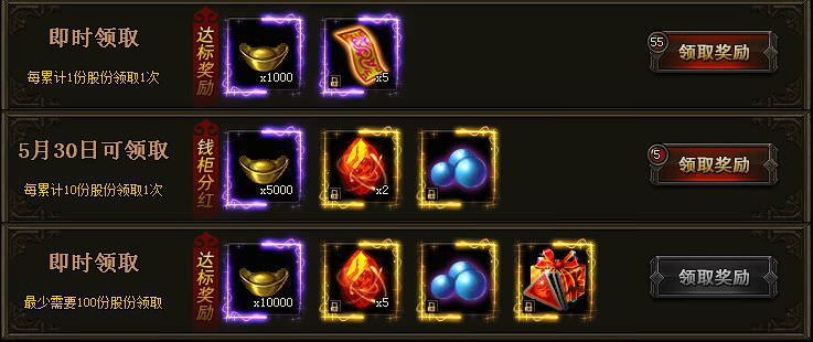 活动期间,每充值8888元宝即可获得1份股份,最高可持有100股份。达到指定要求股份数量和时间要求即可领取奖励!