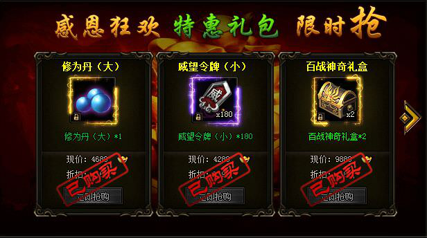 活动期间,修为丹、威望令牌、探宝符、直升丹、百战神奇礼盒、修为直升丹跳楼价出售!(温馨提示:直升丹与修为丹分开出售)