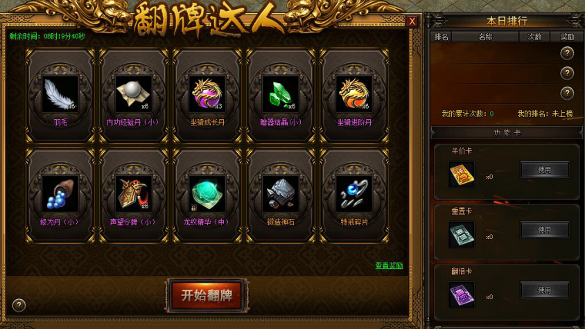活动期间,系统每天随机发放10张奖励牌,牌面显示对应的道具;翻牌时万可花费一定元宝开牌,获得相应的道具奖励;玩家点击“重置”,系统将重新发放奖励牌;系统将在每天0点自动重置奖励牌!