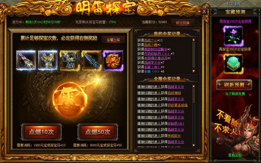 明雷探宝赢豪礼,极品道具送不停!明雷探宝右侧可以刷新出额外的特殊大奖,达到标注的探宝次数即可获得。