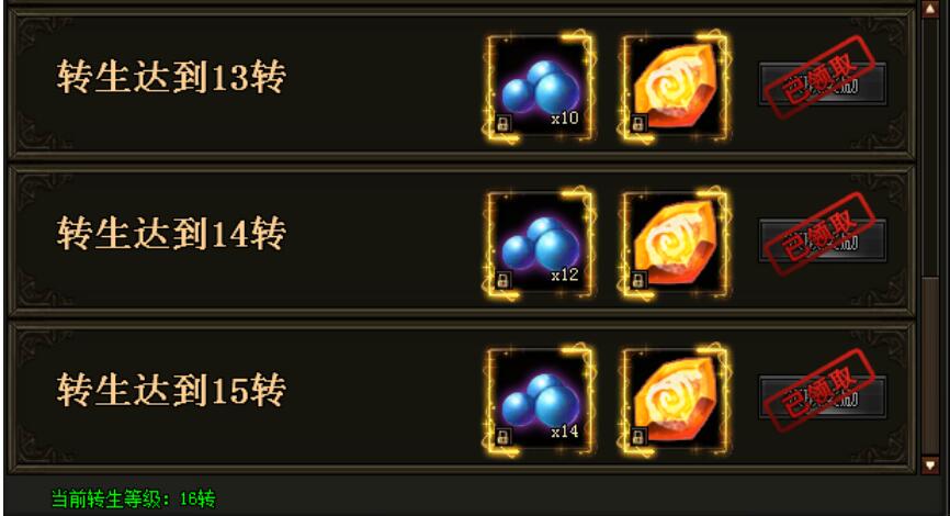 活动期间,转生达到指定要求即可领取相应大奖!每项奖励每人仅限领取一次!