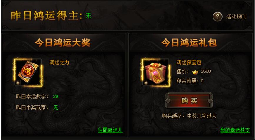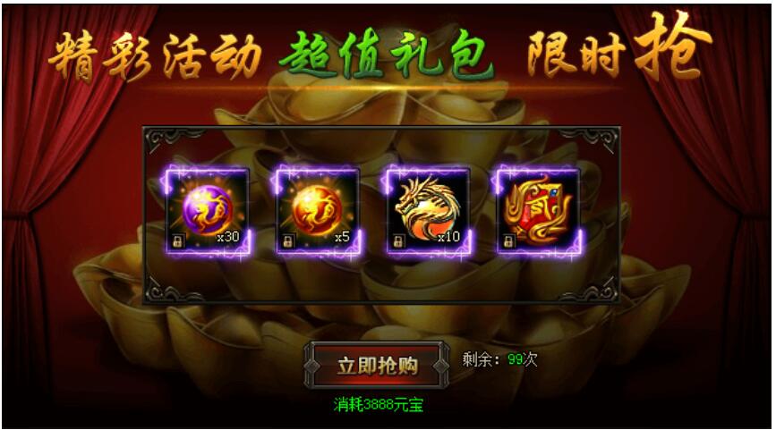 活动期间,购买限购礼包赢取幸运大奖,奖励极品限时称号。(全服限量买到即赚到)购买礼包越多,中奖几率越大!