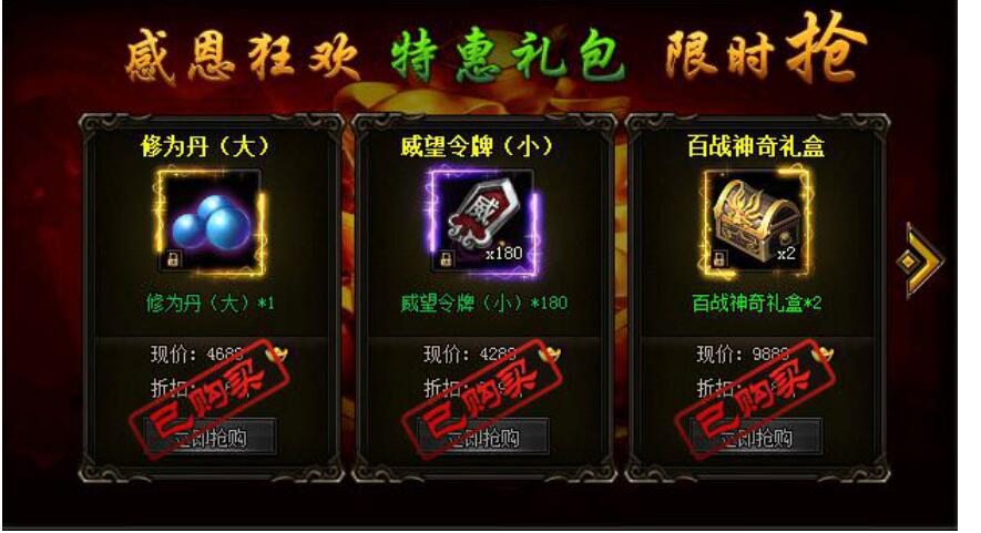 活动期间,修为丹、威望令牌、探宝符、直升丹、百战神奇礼盒、修为直升丹跳楼价出售!(温馨提示:直升丹与修为丹分开出售)