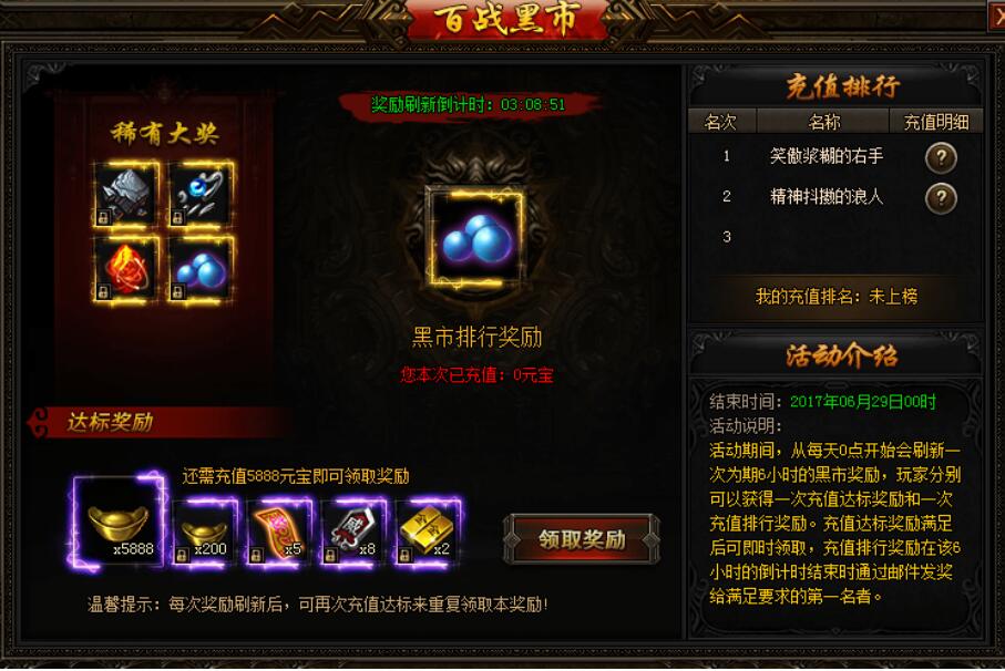 活动期间,每天0点开始刷新一次为期6小时的黑市奖励,玩家分别可以获得一次充值达标奖励跟一次充值排行奖励!(温馨提示:点击充值排行的小问号可以看到排行奖励的领取要求:充值15888元宝)