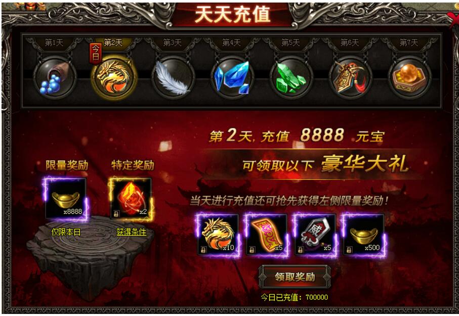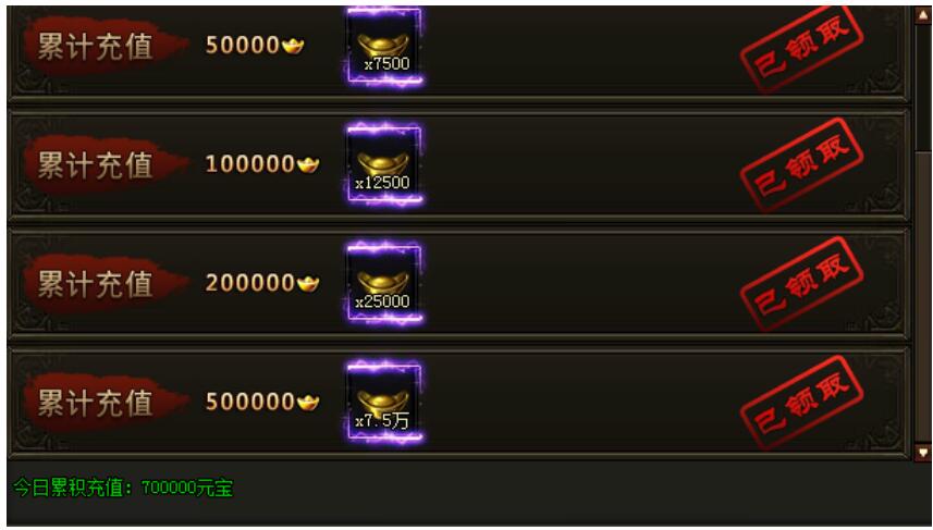 活动期间,玩家每日累计充值对应的元宝即可领取奖励!