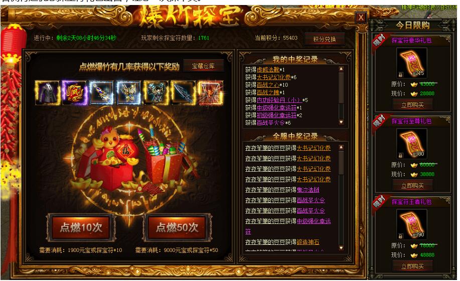 爆竹探宝赢豪礼,极品道具送不停!概率获得:大书记幻化卷、百战神装、9转符文等极品道具!爆竹探宝右侧有超优惠探宝符礼包出售,让您一次探个爽。