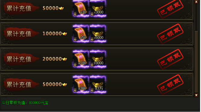 活动期间,每日累计充值指定元宝,即可领取相应的道具!