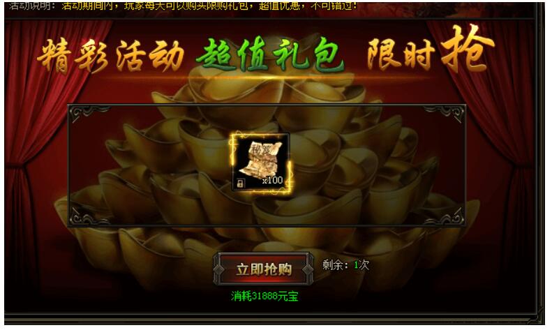 活动期间内,每天可购买限购礼包。(限量每日一次,秘笈碎片固定数量)