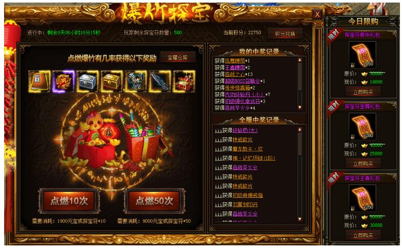 爆竹探宝赢豪礼,极品道具送不停!右侧超优惠探宝符礼包让您一次探个爽!(温馨提示:产出天字秘籍攻击增加18%)