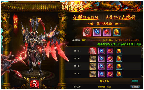 4. 若在活动结束时,没有玩家达到第一的消费数量,则所有玩家按消费高低从第二名开始进行排名;若没有玩家达到2-10名的最低消费,则所有玩家没有排名