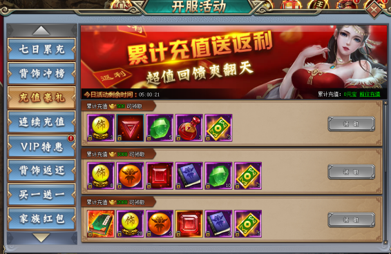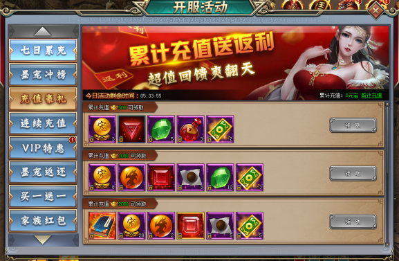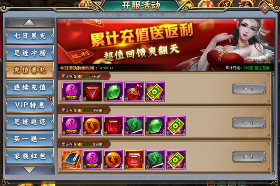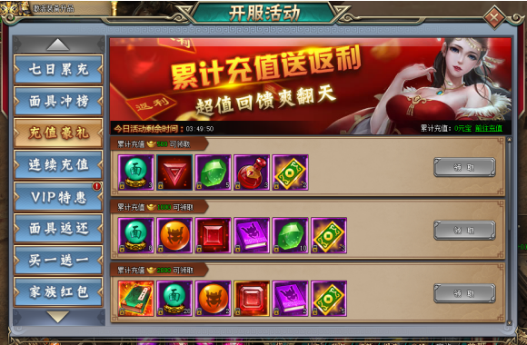 玩家当日累计充值相应金额,即可领取相应档位道具奖励